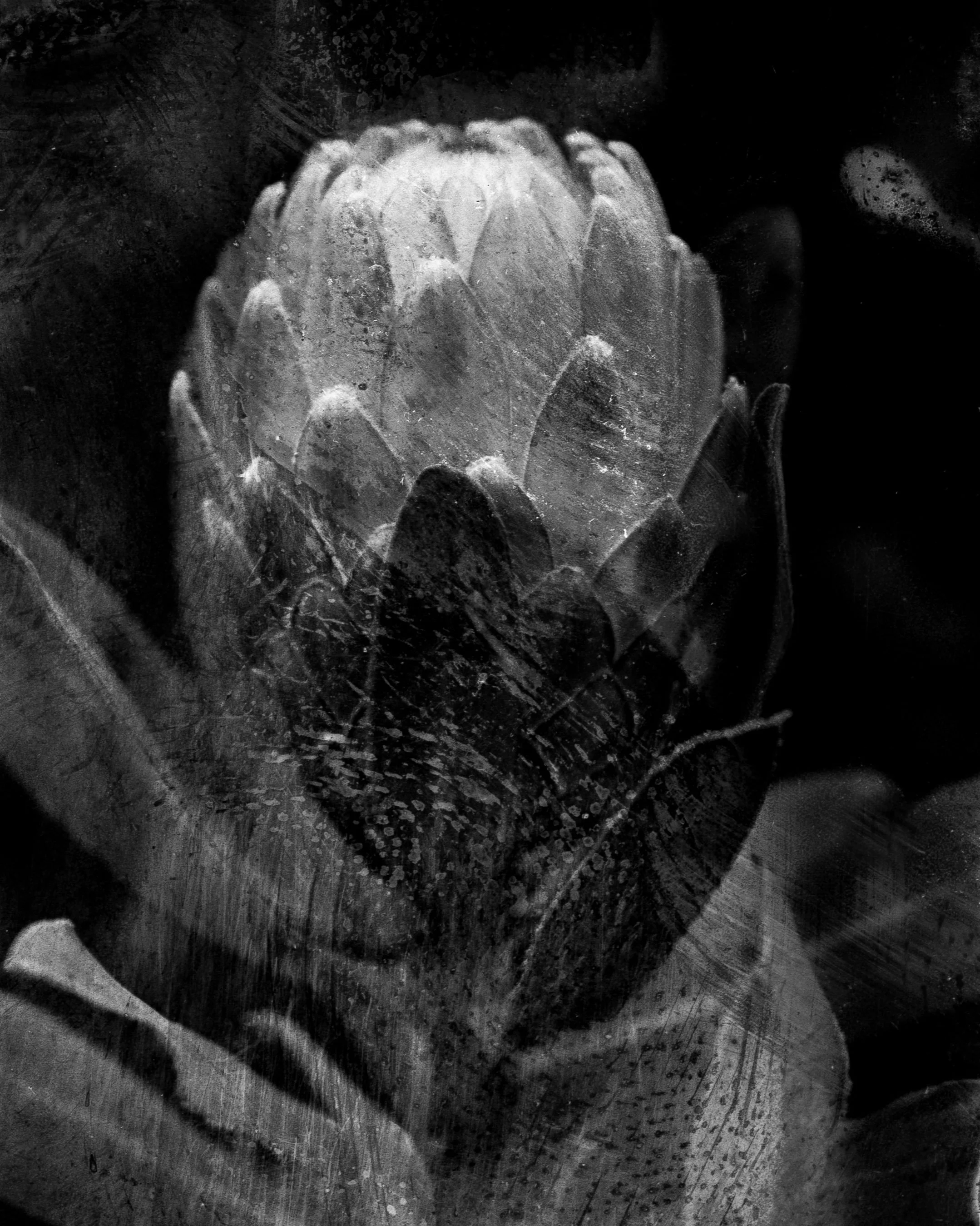 It was early winter and the cold overcast light gave the day a timeless quality. On our way to the beach we stopped to pick roadside proteas and I also collected a jar of water from the ocean. Back home in my apartment’s red-brick laundry I used the water when processing a roll of 35mm film.
