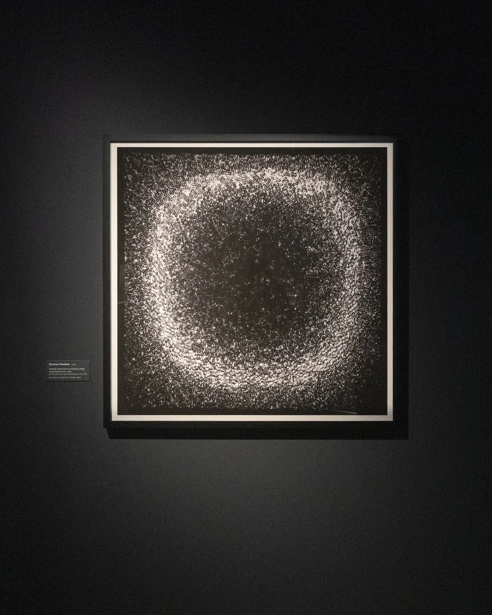 The cymatic figures generated from the songbird's melody were presented as a series of etchings, and the cymatic figure of D# - the harmonic minor key of the bird’s melody and a note of significance to Hawker - was sketched in salt on a 12ft sq steel plate, slowly corroding into a new artwork during the course of the 7-week show. At the close of the show this plate was archived as a giant print - transforming sound, atmosphere and energetic residue into material form.